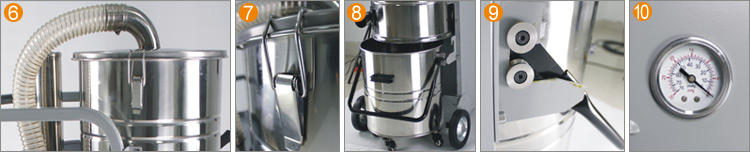 6.大口径PU钢丝进气口,耐磨耐高温。 7.纯不锈钢304耳扣。 8.60L上下抽离式物料收集桶,方便倾倒垃圾。 9.纯不锈钢304光圆,光滑坚固耐用。 10.真空压力表。