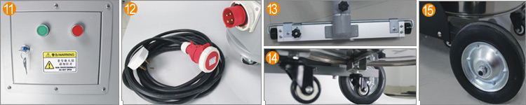 11.触点式开关,独立配电柜设计,方便维护保养机器。 12.8米超长电源线,三相电欧式插座插座方便更改电源线长短。 13.标配50毫米大口径金属配件,提高吸尘效率减少堵塞。 14.采用PU万向脚轮坚固耐用,机器推动时静音效果好。 15.符合人体设计的推手及高质量的脚轮,使移动更方便。