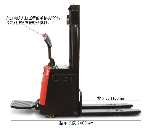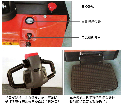 易操作: ·充分考虑人机工程的手柄头设计,各功能按钮方便轻松操作; ·折叠式踏板,具有缓震功能,可消除操作者在行驶过程中路面给予的冲击; ·踏板折叠后,可在较小的空间内低速操纵; ·电子转向,操纵更轻便(电转向)。