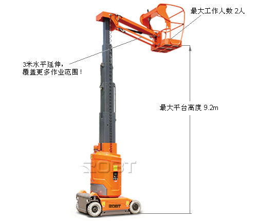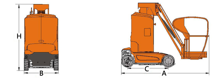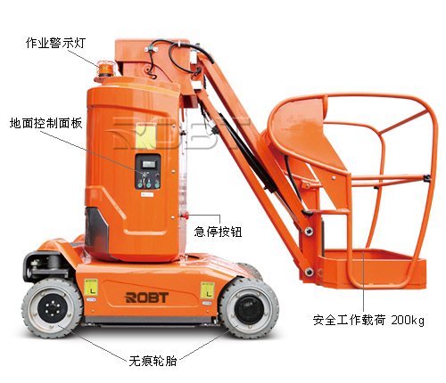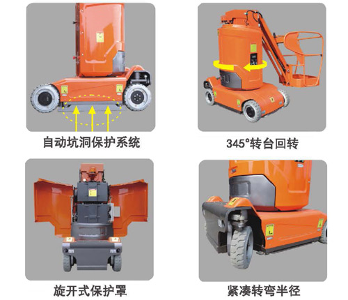 标配: · 比例控制 · 自动坑洞保护 · 横杆门 · 全行程行走 · 无痕轮胎 · 4×2驱动 · 自动刹车系统 · 紧急下降系统 · 紧急停止按钮 · 油管防爆系统 · 故障诊断系统 · 倾斜保护系统 · 动作蜂鸣 选配: · 超重传感器 · 连接到平台的导气管 · 连接到平台的AC电源 · 平台工作灯