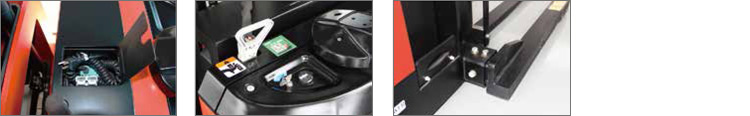 易操作: ·充分考虑人机工程的手柄头设计,各功能按钮方便轻松操作; ·长操作手柄设计,大大降低了转向力,操作轻便; ·货叉可调,适用于各种复杂的托盘和货物; ·慢速行驶功能,将手柄处于近垂直状态,行驶速度会自动降低,便于狭窄空间内实现精确作业; ·侧拉电瓶箱设计,轻松更换电瓶,方便连续作业。