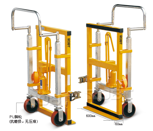 • 专用于搬运重载荷物料• 是运送、搬移、保养和装配的理想工具• 适用于搬运碗柜、保险箱、周转箱和机械设备• 成套出售:包括2个带液压起升器和保护柱的搬运装置。保护柱长5米。驱动手柄可直接控制轮子。轻松搬运,准确定位• 操作步骤:先将起升板至于家具底下,拉紧保护柱。两边都要起升有具以平衡高度• 技术规格:粉末涂层抛光。上部和下部支撑横木涂有防护涂层。4个带滚珠轴承的重载型转向角轮。无印痕聚氨酯轮适用于在铺地毯的地面上操作